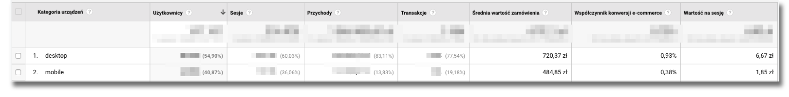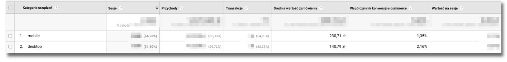 W sklepie X ruch z desktopu i mobile jest bardzo podobny – 54% z desktopu, 40% ze smartfonów. Bardzo duże różnice widać jednak, gdy mówimy o współczynniku konwersji na mobile, który jest ponad 2-krotnie niższy w porównaniu do desktopu. Co za tym idzie, wielkość transakcji, przychodów i wartości koszyka są odpowiednio niższe.