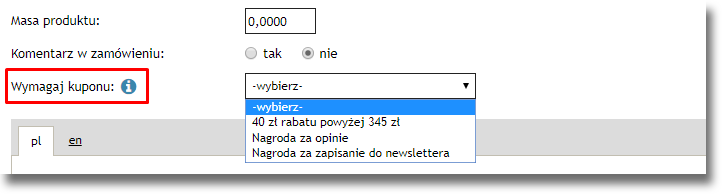 Możliwość ograniczenia sprzedaży danego produktu wyłącznie dla osób posiadających kod rabatowy - w edycji danego produktu (Katalog → Produkty → Edytuj produkt → Informacje ogólne) można wskazać, czy ma być on możliwy do kupienia wyłącznie z wybranym kodem rabatowym czy nie.