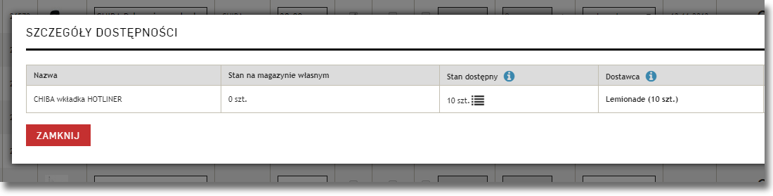 Kolumny wyświetlające stan dostępny produktu z progiem ufności - dla każdego dostawcy można ustawić próg ufności, poniżej którego towary od tego dostawcy nie będą wyświetlane w sklepie. W zakładce Katalog → Produkty po kliknięciu ikony lupy w kolumnie “Stany dostępności” zmodyfikowaliśmy dwie kolumny: