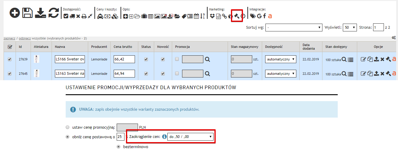 Automatyczne zaokrąglania cen podczas tworzenia promocji ręcznych - podczas tworzenia promocji z widoku Katalog → Produkty, w opcji grupowej nadawania promocji pojawiła się możliwość automatycznego zaokrąglania cen do pełnej kwoty.