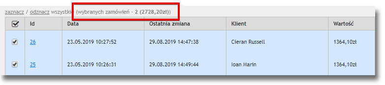 Suma wartości zaznaczonych zamówień - w zakładce Sprzedaż → Zamówienia zaznaczenie wybranych zamówień spowoduje wyświetlanie ich zsumowanej wartości.