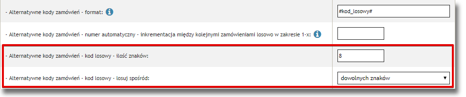 Generowanie alternatywnej numeracji zamówień - w zakładce Ustawienia → Konfiguracja sklepu → Panel → Preferencje administracyjne → Numeracja i kody zamówień dodaliśmy możliwość dodania kodów losowych do numeracji zamówienia. W ustawieniu można określić: Alternatywne kody zamówień - kod losowy - ilość znaków - określ liczbę znaków w kodzie losowym, Alternatywne kody zamówień - kod losowy - losuj spośród: - określenie, czy system ma losować kod wyłącznie z cyfr lub z cyfr i innych znaków.