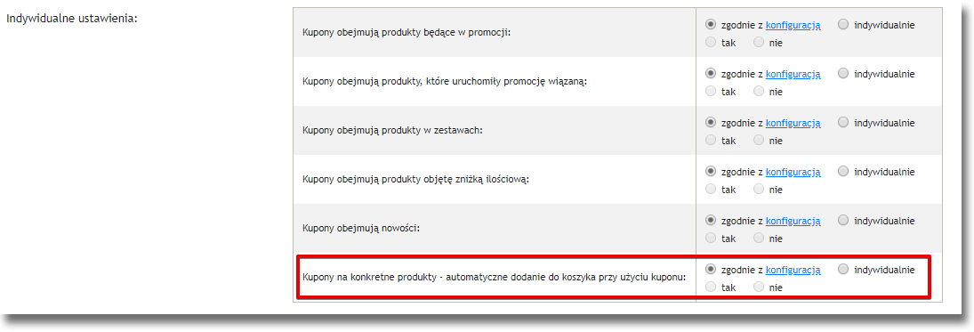 Produkty, których dotyczy kupon określamy za pomocą dynamicznej listy.Dodając min. 3 produkty z tej listy system automatycznie dodaje do koszyka kupon (o ile klient nie skorzystał wcześniej z innego kuponu). Pokazuje starą i obniżoną cenę.