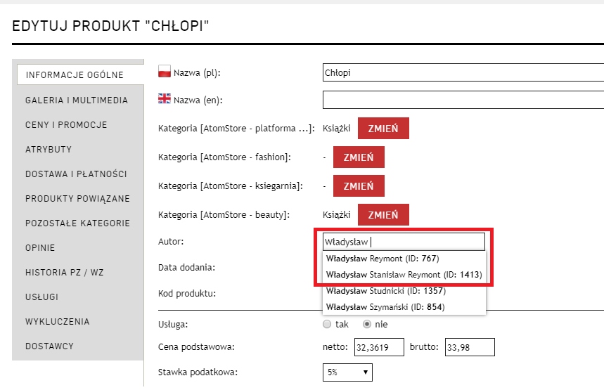 Możliwość rozróżniania producentów podczas przypisywania ich do produktów - w przypadku, gdy w sklepie występuje dwóch producentów o tej samej nazwie (np. autorów książek), w edycji produktu podczas przypisywania producentów system wyświetla ich nazwę oraz ID, co pozwala na przypisanie produktu do jednego z nich.