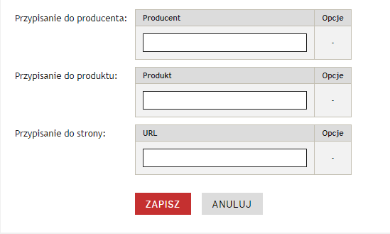 1. Przejdź do zakładki CMS → Banery, a następnie w edycji baneru wybierz produkt, producenta lub stronę do której ma być przypisany baner podając nazwę lub URL strony: