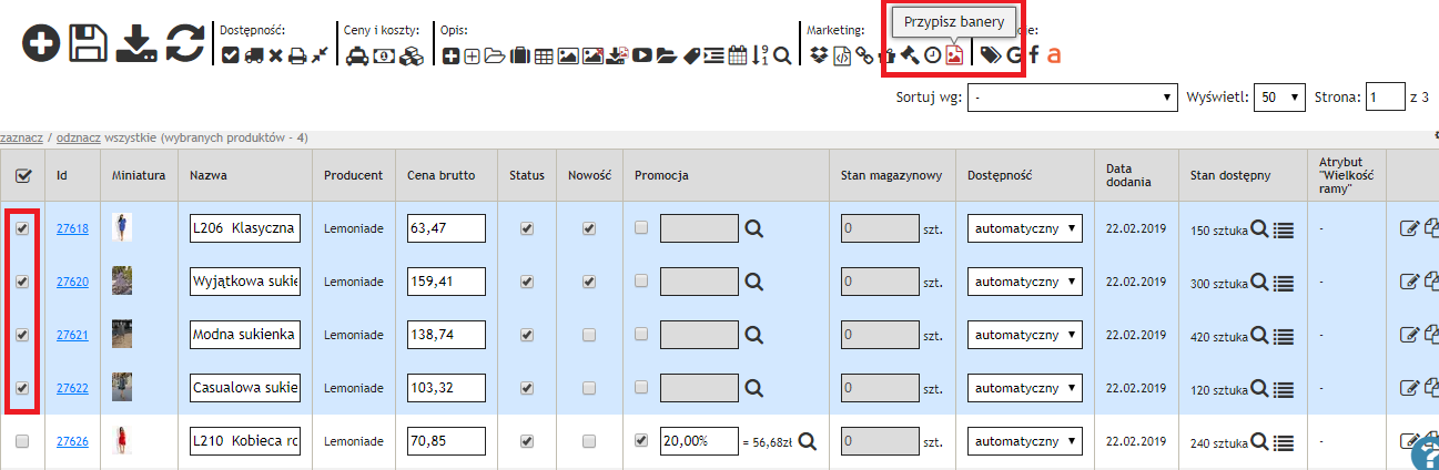 2. W widoku Katalog → Produkty w ramach operacji grupowych wybierz baner, który ma zostać przypisany do wskazanych produktów: