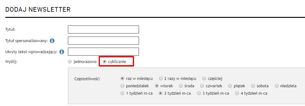 Nowy mechanizm cyklicznej wysyłki newsletterów - podczas tworzenia cyklicznego newslettera (Newsletter → Stwórz nowy) konieczne będzie określenie dokładnych terminów wysyłek, zgodnie z poniższymi ustawieniami: