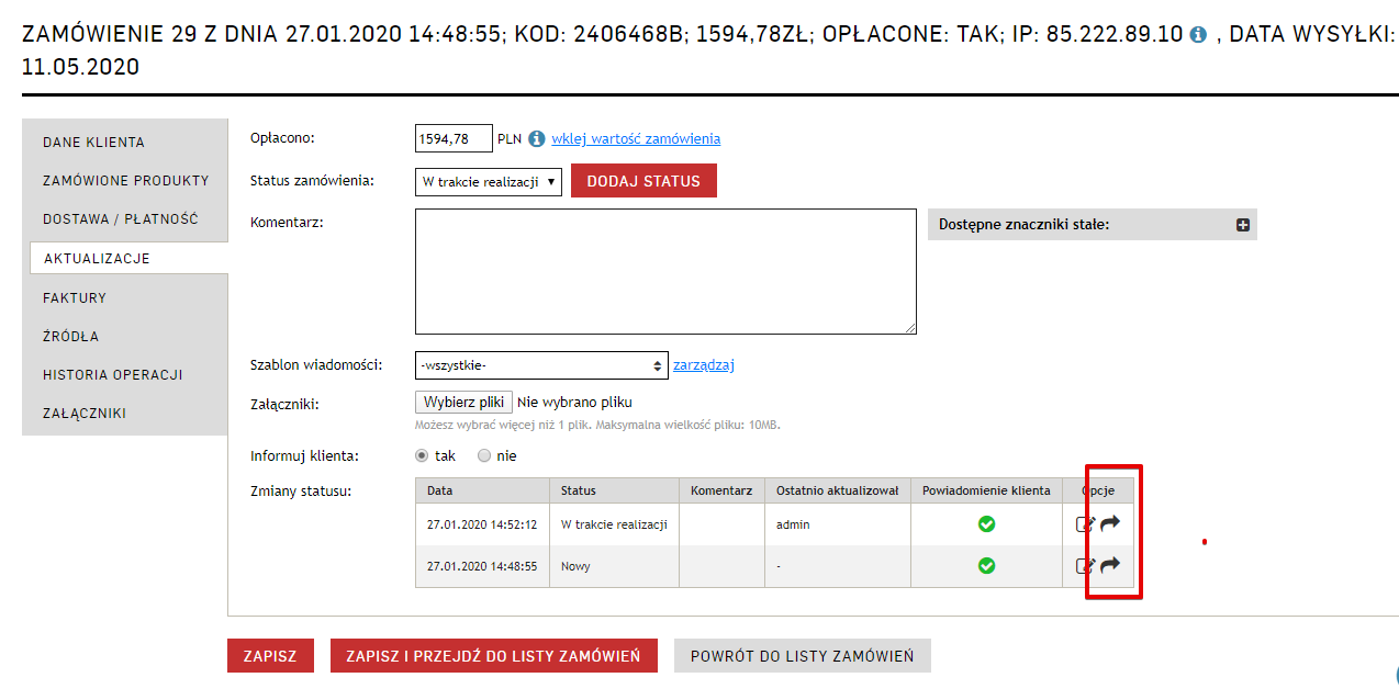 Dodaliśmy możliwość ponownego wysłania wiadomości do klienta dla dowolnego statusu zamówienia - w podglądzie oraz edycji zamówienia (Aktualizacje) przy historii zmiany statusów pojawiła się możliwość ponownego wysłania powiadomienia do klienta dla dowolnego statusu.