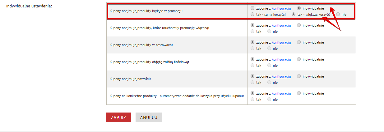 Możliwość określenia maksymalnej korzyści dla klienta w przypadku kuponu - w edycji dowolnego kuponu znalazło się pole “Kupony obejmują produkty będące w promocji: tak - większa korzyść”. W ramach tego ustawienia klient, który kupuje produkty będące w promocji oraz wykorzysta kod rabatowy, otrzyma najkorzystniejszą cenę.