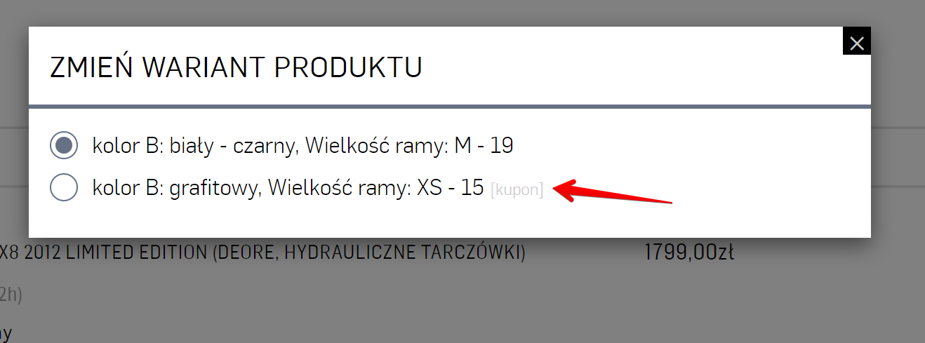 Dodaliśmy oznaczanie wariantów objętych kuponem podczas zmiany produktu w koszyku - Klient, który wykorzystał kupon rabatowy obejmujący dane warianty produktu, otrzyma informację, który z wariantów objęty jest zniżką podczas zmiany w zamówieniu po kliknięciu “Zmień”.