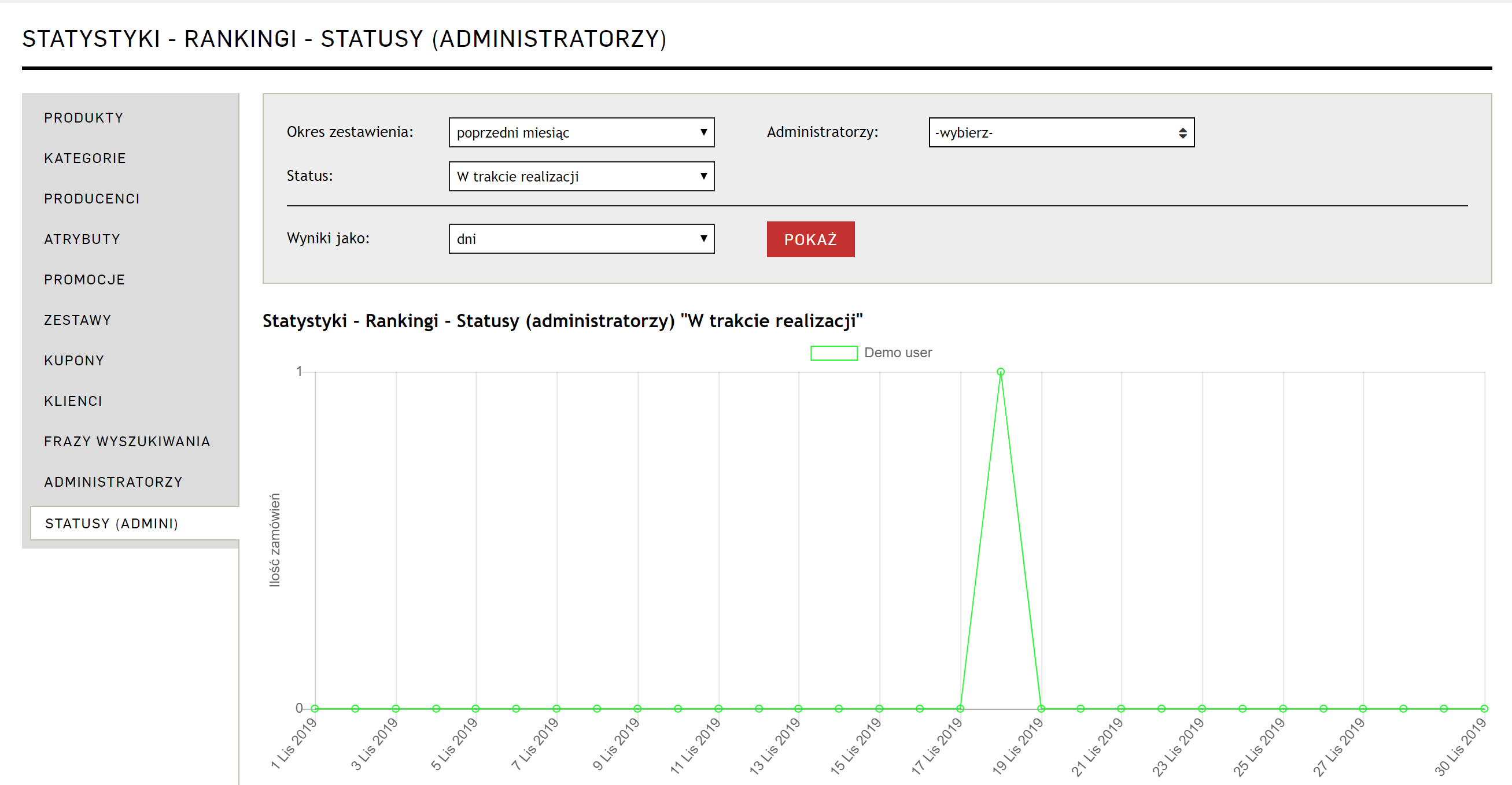 Ranking statusów zamówienia - w zakładce Statystyki → Rankingi → Statusy (Admini) pojawiła się możliwość wyświetlania statystyk administratorów, którzy nadali wybrany status zamówieniom.