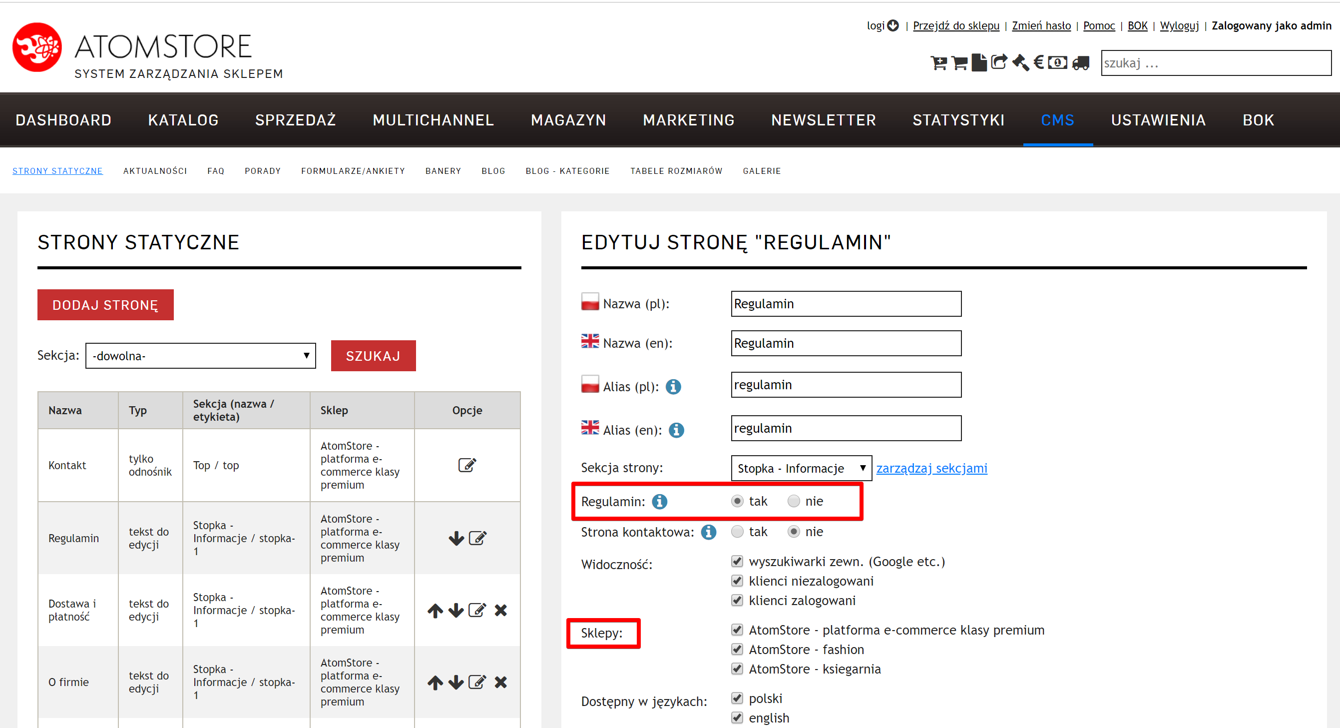 Możliwość przypisania strony statycznej do dowolnego sklepu w multistore - podczas tworzenia/edytowania strony statycznej można wskazać, w którym sklepie powinna się ona wyświetlać. Dodatkowo zaznaczenie opcji "Regulamin" oraz wybranie odpowiedniego sklepu spowoduje wyświetlenie się odpowiedniego regulaminu w drugim kroku koszyka.