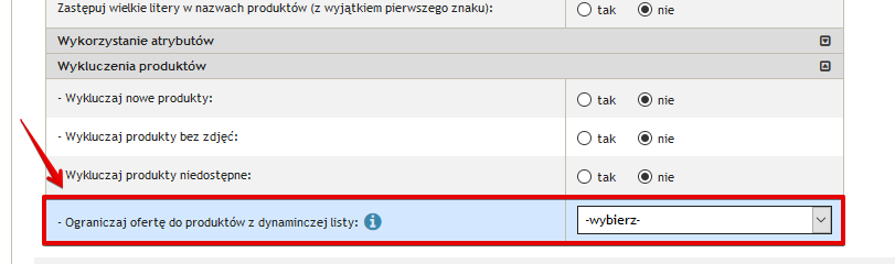 Aby ograniczyć produkty do dynamicznej listy w Google Merchant należy przejść do funkcji “Ograniczaj ofertę produktów z dynamicznej listy” w module Marketing.