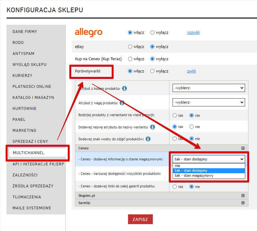 W module Ustawienia → Konfiguracja sklepu → Multichannel → Porównywarki → Ceneo zmodyfikowaliśmy ustawienie „Ceneo - dodawaj informację o stanie magazynowym” w taki sposób, że od teraz będzie można wskazać, który stan produktu ma być wysyłany w pliku produktowym Ceneo jako wartość „Stock”. Może to być stan w oparciu: