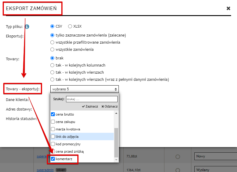 Możliwość eksportu komentarza przypisanego do produktu w zamówieniach