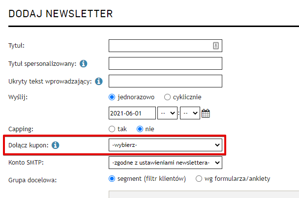Podczas wysyłki newslettera SMS umożliwiliśmy osadzenie znacznika #kod_kuponu#, gdzie podstawiony zostanie automatycznie kod kuponu wybrany w edycji newslettera. Wystarczy w edycji newslettera (Newsletter → Stwórz nowy → Dodaj newsletter) wybrać kupon.