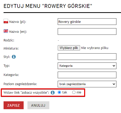 W edycji menu własnego (Katalog → Menu własne → Edytuj) dla typu „Kategoria” dodaliśmy opcję „Zobacz wszystkie”, która pozwoli wyświetlić odnośnik do podkategorii.