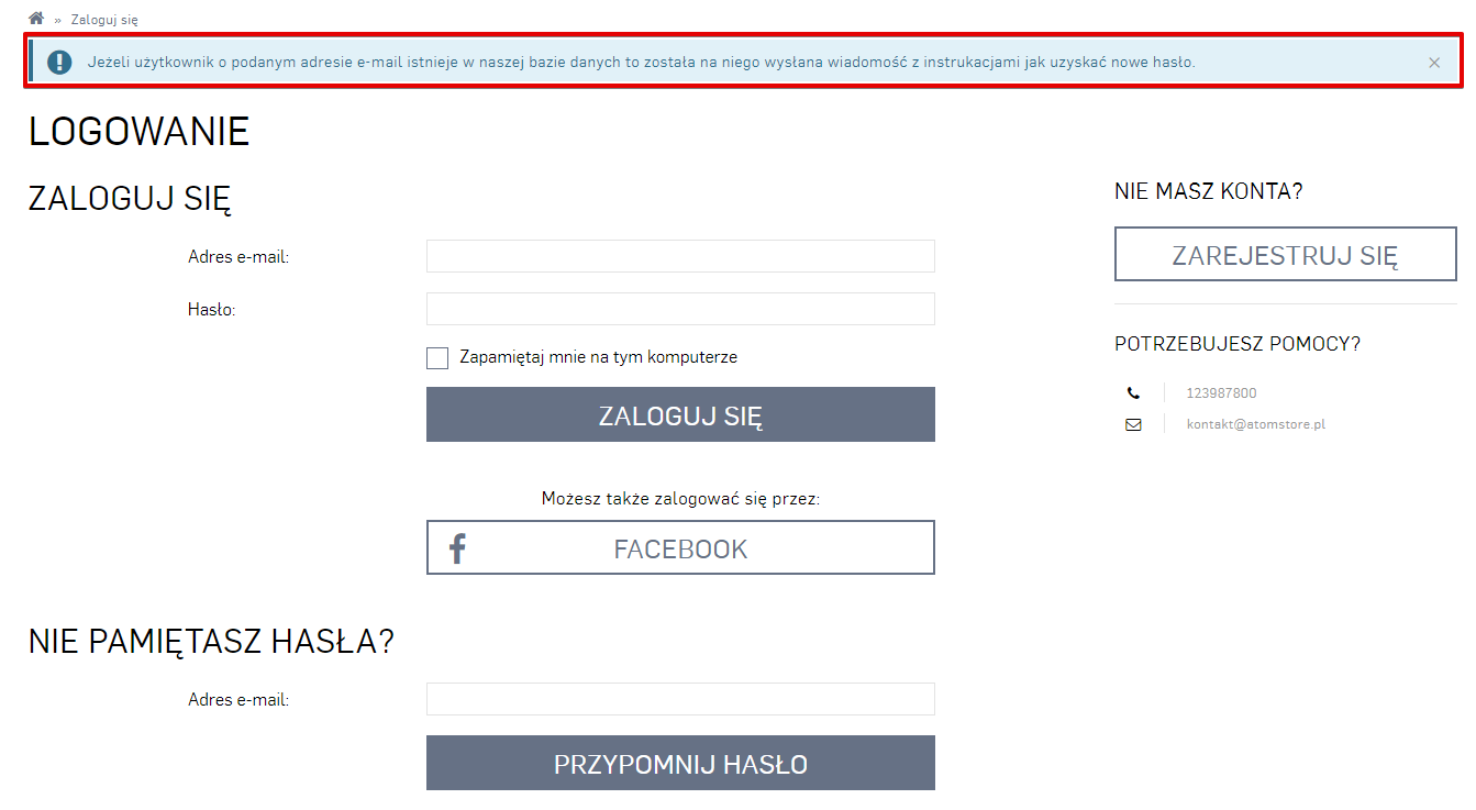 Ze względów bezpieczeństwa zmodyfikowaliśmy komunikat wyświetlany podczas próby zmiany i procesu przypomnienia hasła w taki sposób, że użytkownik zostanie poinformowany o wysłaniu instrukcji o zmianie hasła, jeśli wpisany mail znajduje się w bazie.