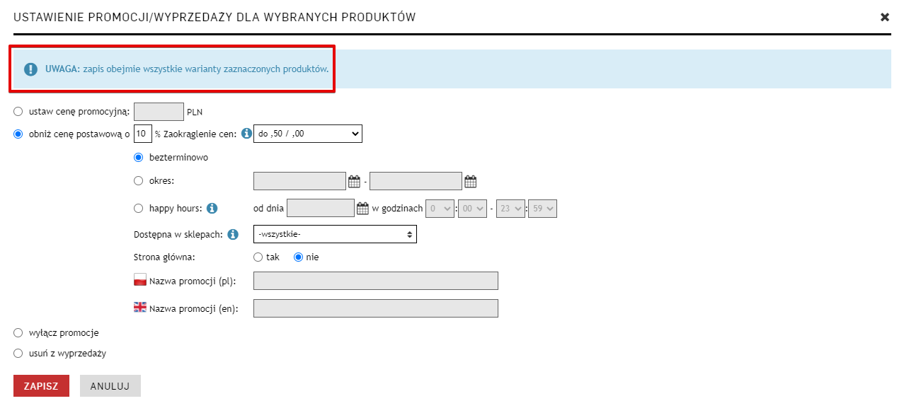 W zakładce Katalog → Produkty → Promocja / Wyprzedaż zmodyfikowaliśmy przydzielanie promocji procentowych na produkt z wariantami. Od tej pory przy grupowym dodawaniu tego typu promocji cena ustalona w procentach będzie odliczana od każdego wariantu.