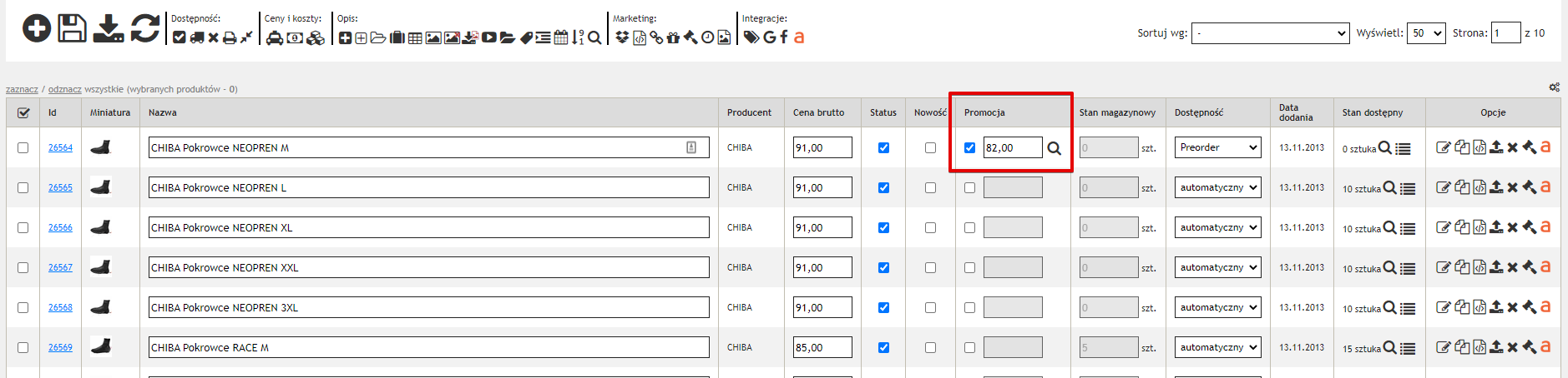 System automatycznie nalicza cenę o 10% niższą na wybrane przeze niego produkty. W kolumnie „Promocja” będzie widniała obniżona cena, która wyświetli się także na stronie sklepu.