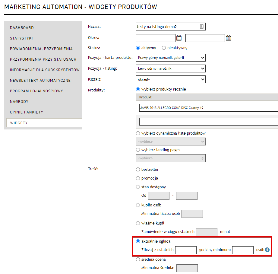 W edycji dowolnego widgetu produktowego w zakładce Marketing → Automation → Widgety → Widgety produktów dla warunku „Aktualnie ogląda” dodaliśmy możliwość włączenia ograniczenia liczby osób oglądających produkt w danym czasie.
