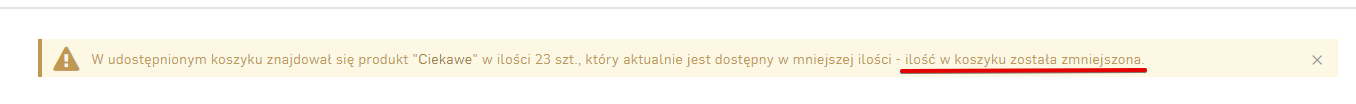 Jeżeli w systemie aktywne jest ustawienie „Automatyczna redukcja ilości w koszyku przy próbie przekroczenia stanu dostępnego - NIE” (Ustawienia → Konfiguracja sklepu → B2B → Koszyki), klient składając zamówienie może dodać ilość ponad stan, ale otrzyma powiadomienie o zmniejszeniu liczby zamawianych produktów z powodu ich niedostępności, przechodząc do drugiego kroku koszyka. Wcześniej nie był informowany o przyczynie zmiany liczby produktów w koszyku.