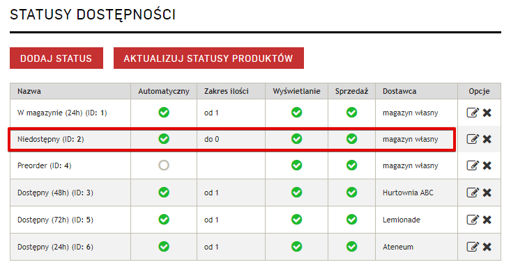 Uwaga, jeśli w sklepie dostępny jest status (Magazyn → Status dostępności), który uwzględnia ilość na magazynie własnym do 0 sztuk i posiada flagę „Sprzedaż”, to produkty dodawane wówczas do koszyka nie będą redukowane do stanu magazynu własnego przy udostępnianiu koszyka (do tej pory były).