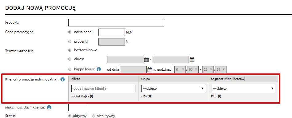 Możliwość przypisania promocji do klienta, grupy lub segmentu (filtra klientów) - podczas tworzenie promocji na wybrane produkty możemy zdefiniować, czy ma ona dotyczyć wszystkich, wybranych klientów, grupy klientów (Sprzedaż → Grupy), segmentu – filtra klientów (Newsletter → Segmenty (Filtry Klientów)).