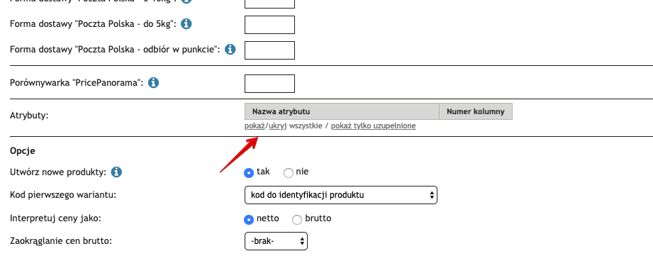 Ukrycie list dostawców w formularzu importu - w panelu importu ukryliśmy długie listy dostawców i atrybutów. Administrator otrzymał jednak możliwość łatwego rozwinięcia listy.