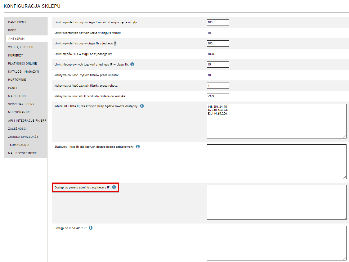 W zakładce Ustawienia → Konfiguracja sklepu → Antyspam dodaliśmy ustawienie „Dostęp do panelu administracyjnego z IP”, które pozwala wskazać konkretne numery IP, z których możliwe będzie zalogowanie do panelu administracyjnego. Próba logowania z innego adresu spowoduje wyświetlenie błędu.