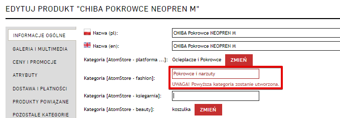 W zakładce Katalog → Produkty → Edytuj produkt → Informacje ogólne dodaliśmy informację „Uwaga! Powyższa kategoria zostanie utworzona”, która pojawia się, gdy administrator sklepu w edycji produktu wskaże kategorię, która nie istnieje w sklepie. Jeśli administrator sklepu wybierze nieistniejącą kategorię, to zostanie ona utworzona.