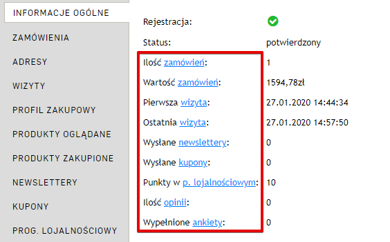 W zakładce Sprzedaż → Klienci → Klient → Informacje ogólne umożliwiliśmy linkowanie do odpowiednich zakładek, np. do zamówień, newsletterów i kuponów.
