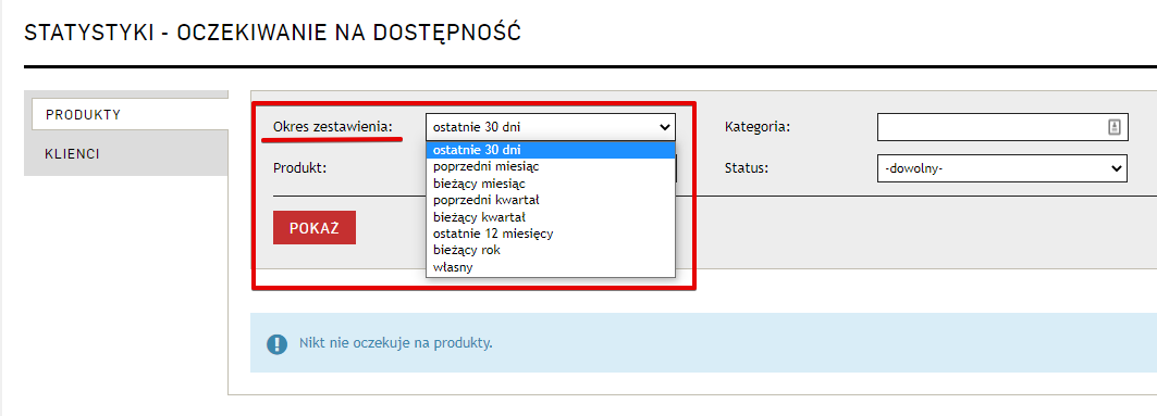 Określenie dat zestawienia w statystykach „Oczekiwanie na dostępność" W zakładce Statystyki → Oczekiwanie na dostępność → Produkty dodaliśmy filtr „Okres zestawienia”, który pozwoli oglądać statystyki produktów w zdefiniowanym okresie, np. w bieżącym kwartale lub poprzednim miesiącu.