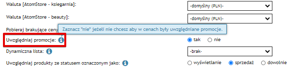 W edycji dowolnej porównywarki dodaliśmy opcję „Uwzględniaj promocje”, która pozwala określić, czy do porównywarki mają zostać wysłane ceny z ustawionego cennika czy ceny promocyjne ze sklepu (jeżeli w produkcie została ustawiona promocja).