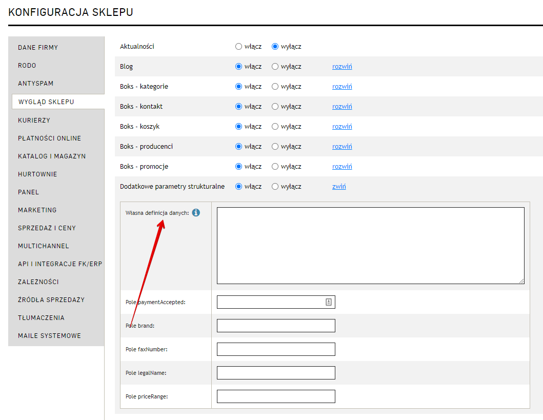 W zakładce Ustawienia → Konfiguracja sklepu → Wygląd sklepu → Dodatkowe parametry strukturalne dodaliśmy ustawienie „Własna definicja danych”, które pozwala na uzupełnienie własnych parametrów strukturalnych (kodu, który będzie widniał w sekcjistrony).