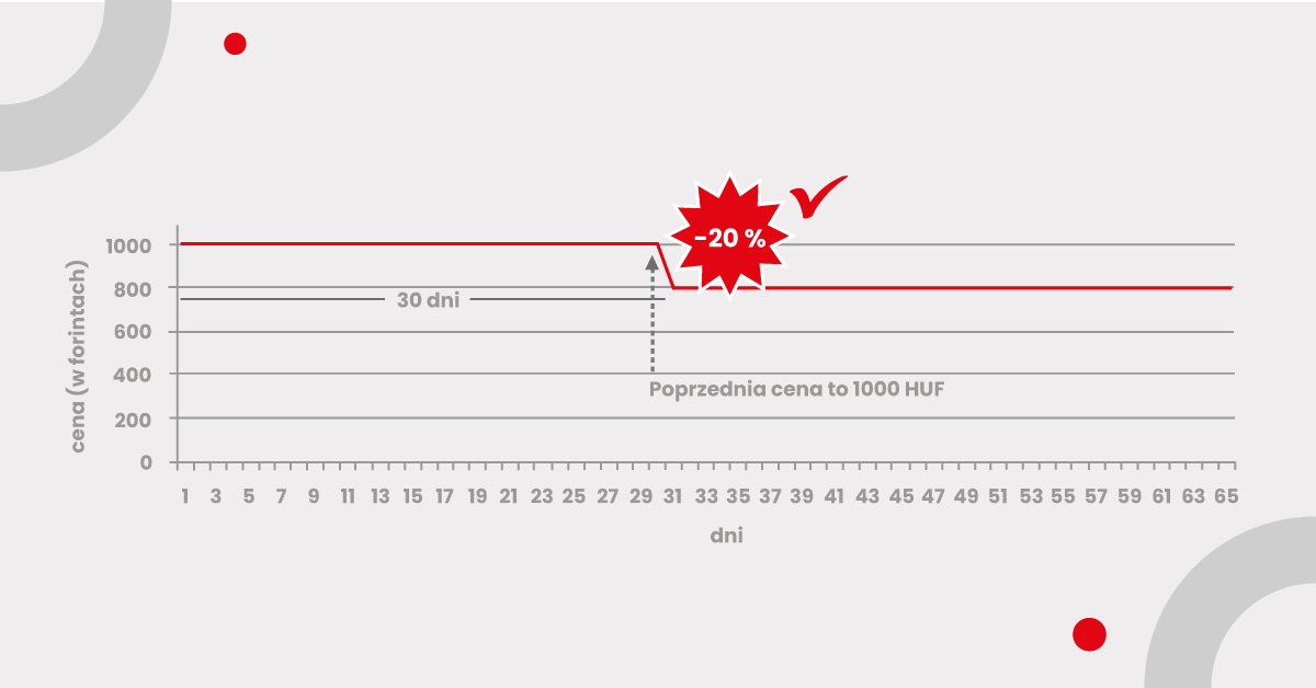 Produkt w dniu premiery i przez kolejne 30 dni posiadał cenę 1 000 HUF. W 31. dniu sklep zastosował jedną obniżkę (-20%). Poprzednia cena (najniższa w ciągu ostatnich 30 dni) dla tego produktu to 1 000 HUF. Zatem na karcie produktu powinny pojawić się dwie ceny: