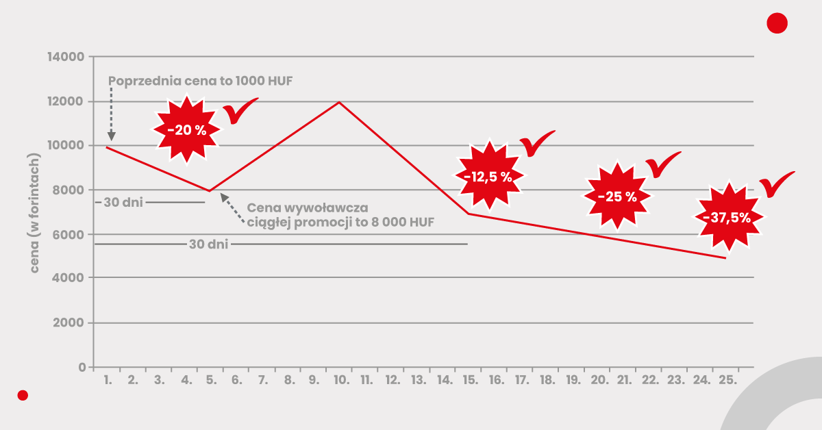 Zgodnie z węgierskimi przepisami, kolejne promocje powinny być liczone od kwoty 8 000 HUF, czyli najniższej ceny w ciągu ostatnich 30 dni przed wystartowaniem nowej kampanii promocyjnej. Jest to w rzeczywistości wcześniejsza cena promocyjna. Sprzedawca nie może wskazać tutaj 10 000 HUF jako ceny pierwotnej. Każda kolejna obniżka ceny powinna być liczona od ceny 8 000 HUF. Jeżeli nowa cena ma wynosić 700 HUF to wysokość rabatu należy wskazać w stosunku do kwoty 8 000 HUF tj. 12,5% lub kwotowo 1 000 HUF. Zatem informacja na karcie produktu powinna wyglądać następująco: