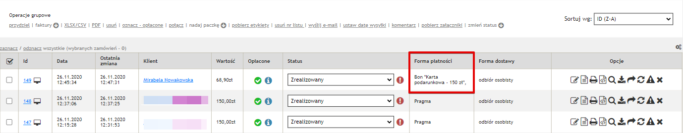 2. W momencie zrealizowania zakupu bonem, zamówienie automatycznie otrzymuje wybrany w ustawieniach wcześniej status (w naszym przypadku jest to Zrealizowany) oraz wyświetlana jest informacja o formie płatności.