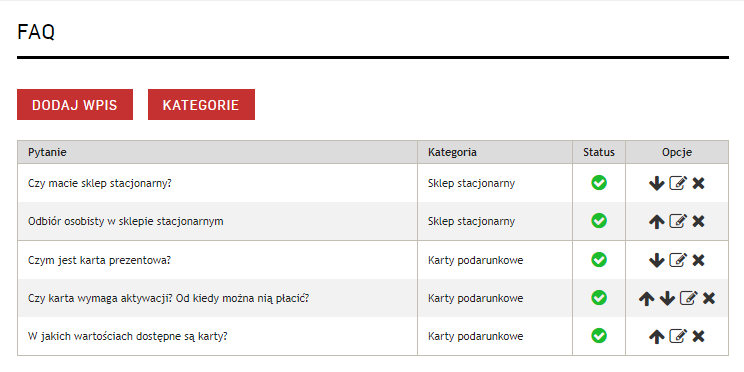 Wykorzystaj kolejne nasze wbudowane narzędzie FAQ (CMS → FAQ) i przygotuj listę najczęściej zadawanych pytań i odpowiedzi o karty podarunkowe. Nowa funkcja kategorii FAQ pozwoli Ci uporządkować ten element w sklepie. Dodaj pytanie, wybierz kategorię i przygotuj odpowiedź – tylko tyle!