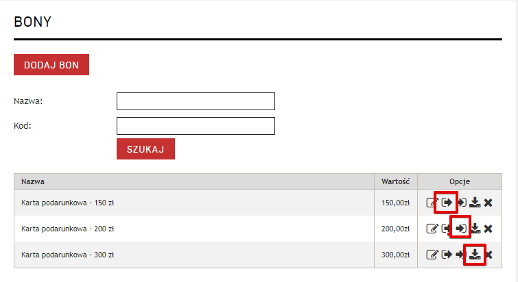 Raporty sprzedaży i wykorzystania bonów można wygenerować do pliku XLS. Ostatnia ikona służy do pobierania wygenerowanych kodów przez system w zależności od ustawienia opcji „Wygeneruj kody bonu”.