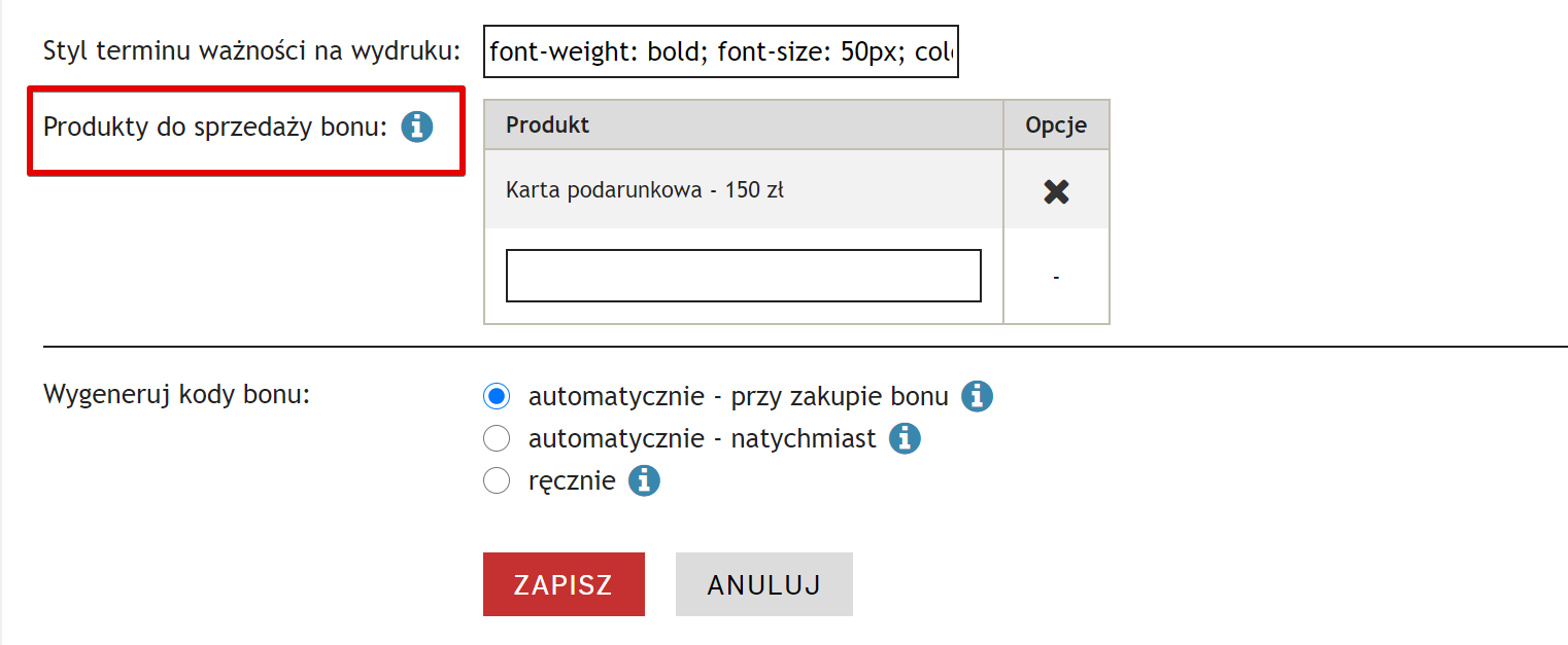 7. Wskaż Produkty do sprzedaży bonu, czyli produkty, po zakupie których klient otrzyma kod bonu. O tym, jak stworzyć taki produkt piszemy poniżej. Jeżeli nie masz jeszcze utworzonych takich produktów sklepie, możesz zapisać pracę.