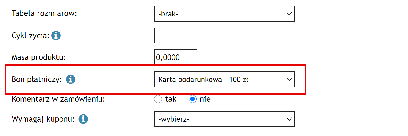 4. Następnie powiąż produkt z wybranym bonem płatniczym. W zakładce Informacje ogólne przejdź do pola Bon płatniczy i wybierz z listy istniejący bon, który zostanie wysłany do klienta po realizacji zamówienia.