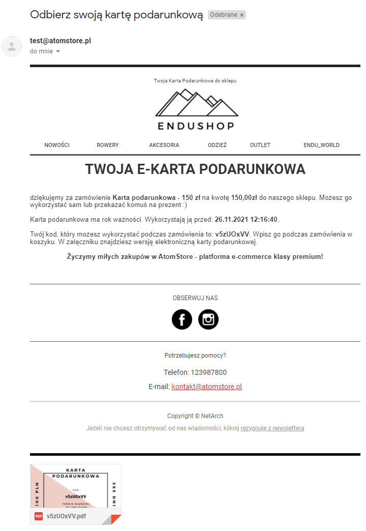 Przykładowa wiadomość z informacją o wysyłce bonu podarunkowego z systemu AtomStore