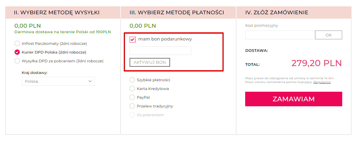 Przykład koszyka z aktywnym modułem bonów płatniczych u naszego klienta FemiStories.com.