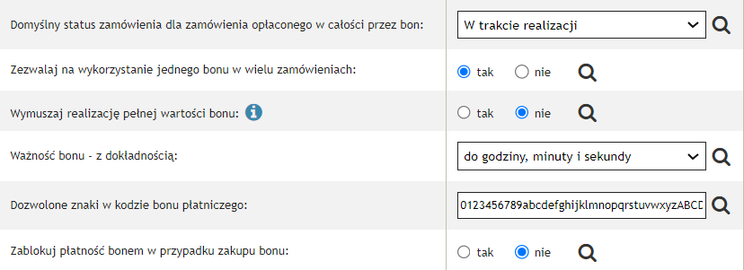 - klient może zrobić zamówienie na mniejszą kwotę niż wartość bonu płatnicznego - jeżeli tak, wybierz w "Wymuszaj realizację pełnej wartości bonu" opcję "NIE".
