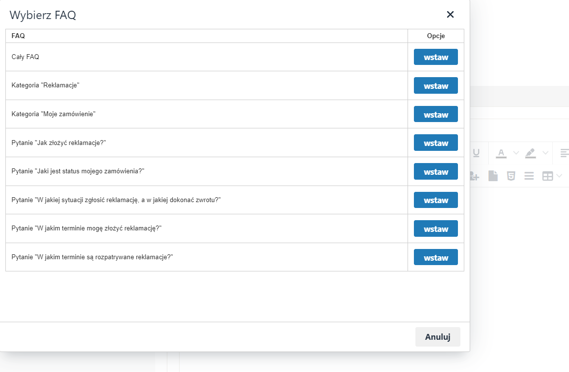 FAQ możesz dodać automatycznie w kilku miejscach na stronie sklepu m.in. na stworzonym wcześniej landing page lub stronie statycznej. Wystarczy, że użyjesz znacznika FAQ i wstawisz w wybranymi miejscu kategorię FAQ (lub wybrane pytanie).