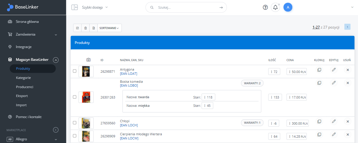 Widok magazynu BaseLinker, do którego możesz importować informacje o produktach znajdujących się w Twoim sklepie internetowym.