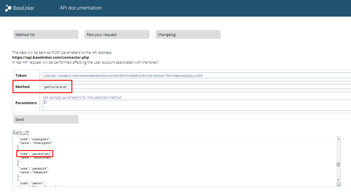 3. W zakładce Token wklej skopiowany ciąg liczb. Następnie z listy Metod wybierz metodę getCouriersList. Kliknij Wyślij/Send. Po chwili system wygeneruje listę kurierów („name”) i ich zewnętrzne ID („code”).