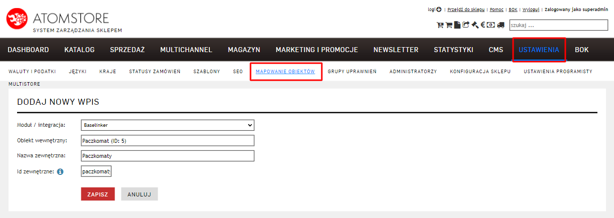 4. Przejdź do systemu AtomStore i wybierz Ustawienia → Mapowanie obiektów → Dodaj wpis.