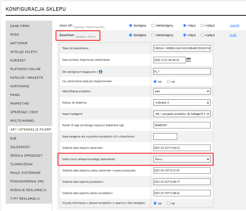 Wymiana informacji między BaseLinkerem a AtomStore następuje automatycznie. Informacje na temat ostatnich aktualizacji można znaleźć w zakładce Ustawienia → Konfiguracja sklepu → API i integracje FK/ERP → BaseLinker → Ostatnia data... Jeżeli chcesz włączyć integrację z narzędziem, prosimy o kontakt z BOK. Integracja jest dodatkowo płatna (szczegóły podczas kontaktu z naszym zespołem).